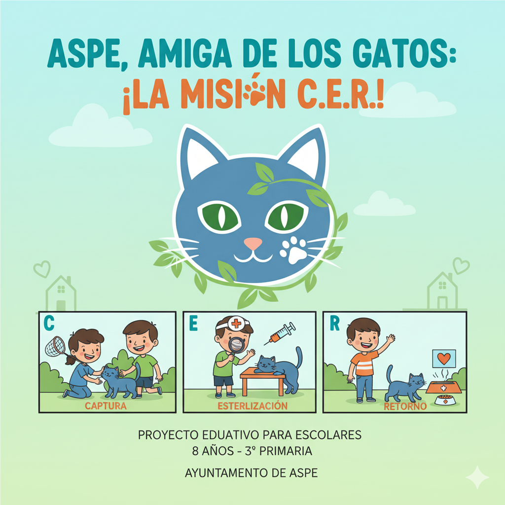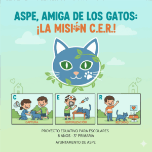 Reto cívico y medioambiental crucial para el municipio de Aspe: la gestión ética de las colonias felinas urbanas. A través del método C.E.R. (Captura, Esterilización y Retorno), buscamos transformar la percepción de los gatos comunitarios, promoviendo la empatía, la tenencia responsable y el civismo desde la infancia. A la edad de 8 años (3º de Primaria), los niños están en una etapa ideal para asimilar conceptos de responsabilidad, biología básica y normas de convivencia social.